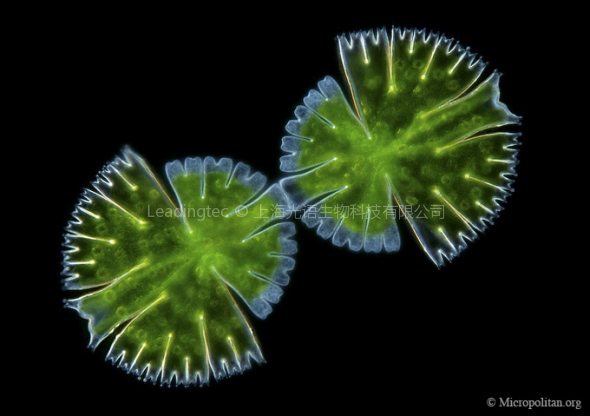 硅藻最令人稱奇的是那一對硅質(zhì)瓣殼,一只硅藻通常標(biāo)配兩塊瓣殼,它倆一大一小相互扣合保護住細胞質(zhì),同時又保證有充分的光線透過。而每一瓣殼上都會有放射狀花紋,如果這只硅藻是圓盤狀的小環(huán)藻,那這個花紋通常呈中心放射狀,如果藻是舟形或是桿狀的,那殼的縱向會看到一條軸,花紋呈軸對稱分布。分裂繁殖的時候,上下兩半殼分道揚鑣,分裂出的兩只細胞再分別為它們合成出有著同樣精細花紋的另一半。這些小玻璃工藝品上漂亮的圖案在普通光學(xué)顯微鏡下并不明顯,但若將光源設(shè)為暗背景,通過多彩的折射光就能看到它們的精巧紋身。