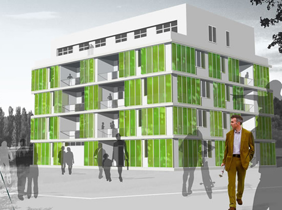 這座建筑正面的鑲嵌玻璃裝有生物反應(yīng)器,內(nèi)有微藻類(lèi)。這些藻類(lèi)能夠產(chǎn)生生物量和熱量,是可再生能源。此外,這一系統(tǒng)還能為整座建筑隔熱保溫,隔離噪音。建筑西南面和東南面已安裝了129臺(tái)生物反應(yīng)器,尺寸為2.5×0.7m。反應(yīng)器由能量管理中心控制,產(chǎn)生熱量。
