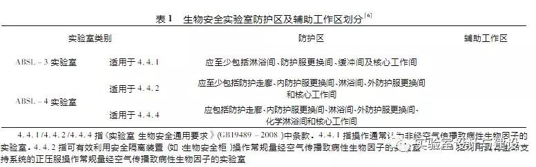 ????實驗室氣密性要求是對實驗室防護(hù)區(qū)的氣密性要求。實驗室的防護(hù)區(qū)是實驗室區(qū)域內(nèi),生物風(fēng)險相對較大,需對實驗室的平面設(shè)計、圍護(hù)結(jié)構(gòu)的密閉性、氣流以及人員進(jìn)入、個體防護(hù)等進(jìn)行控制的區(qū)域(表1)。不同級別實驗室對防護(hù)區(qū)的劃分不同。