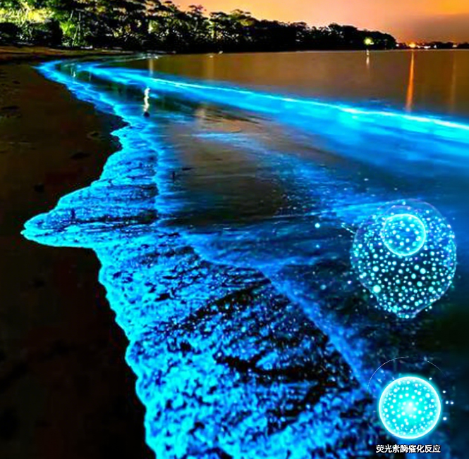 當(dāng)外界擾動傳來 —— 可能是小魚蝦游過的水流,也可能是海浪的顛簸,細(xì)胞會立刻啟動 “發(fā)光程序”:液泡膜產(chǎn)生微弱的動作電位,就像按下開關(guān),閃光體內(nèi)的 pH 值隨之下降,原本 “安靜” 的熒光素酶被激活。這時(shí),熒光素會在酶的作用下與氧氣快速結(jié)合,發(fā)生氧化反應(yīng),過程中釋放的能量轉(zhuǎn)化為光,波長恰好落在 474-476nm 之間,于是我們便看到了那抹清澈的淡藍(lán)色。
