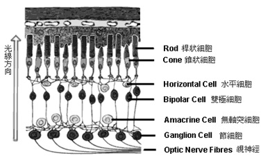而視網(wǎng)膜的構(gòu)造分為 3 層,這 3 層結(jié)構(gòu)處理視覺訊號的順序,正好和入射光線的方向相反。光線射入眼底后,會先射到最內(nèi)層的“感光細(xì)胞”──視椎(cones)細(xì)胞及視桿(rods)細(xì)胞,并把光訊號轉(zhuǎn)為電訊號和化學(xué)訊號,傳給中間層細(xì)胞進(jìn)行處理,處理過的訊號再傳給最外層的“神經(jīng)節(jié)細(xì)胞”。