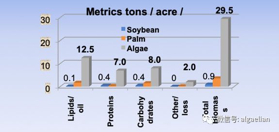 與棕櫚、大豆相比,藻類生物飼料的生產(chǎn)效率明顯提高