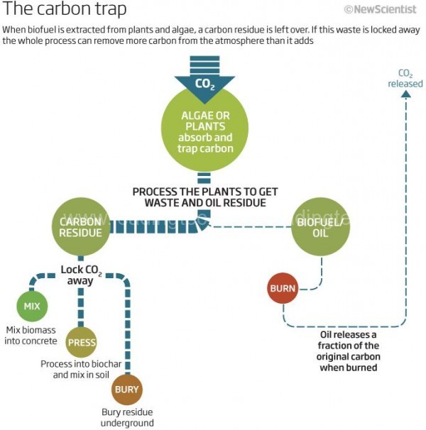 確實(shí),這不是什么普通的石油。它屬于一類神奇的“負(fù)碳”燃料,能把碳從大氣中抽出并一勞永逸地封鎖起來。其中倒也沒什么深?yuàn)W的原理——你栽種某種植物(在這里是藻類),待它們從空氣中吸收一定的CO2,將它們的油份榨出,就能得到碳含量豐富的殘?jiān)?。它們正是“?fù)碳燃料”的關(guān)鍵。如果將這殘?jiān)械奶假A存起來,暫時(shí)阻止它們分解到空氣中,空氣中CO2的減少量就會(huì)超過這些生物燃料的排放量。
