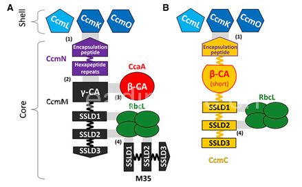 微生物的微區(qū)室是(BMCs)是指一類(lèi)自我裝配的結(jié)構(gòu)相似、更能多樣化的細(xì)胞器,在其蛋白外殼保護(hù)下,可隔絕外部的生化反應(yīng)。由于BMCs功能多樣化,因此在合成生物學(xué)的應(yīng)用中,可作為資源豐富的代謝模塊。在藍(lán)細(xì)菌中,羧酶體是第一個(gè)被鑒定的BMC,在這個(gè)微區(qū)室中進(jìn)行著碳濃縮,通過(guò)隔絕二磷酸核酮糖羧化酶與碳酸酐酶在其蛋白殼內(nèi)以提高二氧化碳的固定。羧酶體可為BMCs的研究提供一個(gè)理想的測(cè)試系統(tǒng),因?yàn)樗{(lán)細(xì)菌需要具有功能的羧酶體才可存活。因此,羧酶體深深地吸引了研究者們的目光。