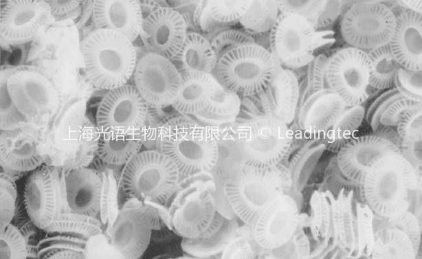顆石藻細(xì)胞體內(nèi)有一個細(xì)胞核和一對黃褐色載色體。在細(xì)胞膜外包有粘膠質(zhì)外層 ,此層的內(nèi)側(cè)分布著直徑約 1 μ m 的非礦物質(zhì)的鱗片 ,在膠質(zhì)層中或其表面分布有一些細(xì)小的圓粒 , 即顆石。有些顆石藻在生命周期中具有具鞭毛的活動期和無鞭毛的非活動期。在活動期利用其鞭毛在海洋表層水體中運動。在非活動期,近岸種在水底停息,大洋性種在水層中消極漂浮。一般在非活動期細(xì)胞形成顆石,活動期不具顆石,或者具有不同于非活動期的另一類顆石。多數(shù)顆石藻為自養(yǎng)生物, 藉助陽光和水中的二氧化碳、硝酸鹽和其它非有機(jī)鹽營光合作用。一些沿岸種利用有機(jī)氮營自養(yǎng)作用。有些類別攝食細(xì)菌和小的藻類是異養(yǎng)生物。在水中的生長速度較快, 一般一天繁殖一次。每一個細(xì)胞上, 顆石的數(shù)目因不同屬種而不盡相同,一個細(xì)胞上的所有顆石組成近于球形至卵形的“外骨路”,稱為顆石球。顆石藻死亡后, 顆石球解體為許多顆石,并可形成化石而保存下來。顆石的直徑甚小,一般 1-15 μ m 左右。它數(shù)量多、個體小,是形成大洋底鈣質(zhì)軟泥的主要成分。