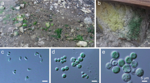 2. 上圖a&b酸性溫泉水池及附近巖石上的青綠藻(日本,Dr. Sumiya);下圖c-e為同比例標(biāo)尺下三種青綠藻的光鏡照片:(cCyanidioschyzon merolae 10D、(d)Cyanidium caldarium RK-1和(e)Galdieria sulphuraria 074Miyagishima et al., 2017