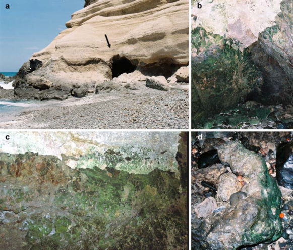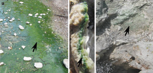 美國黃石國家公園里的青綠藻:(a)酸性溫泉溪流中形成的藻苔/藻墊,(b)在沉積巖的表殼及表殼下的青綠藻,(c)硫磺煙霧中的巖石表面生長的青綠藻。(Valérie Reeb & Debashish Bhattacharya,2010)