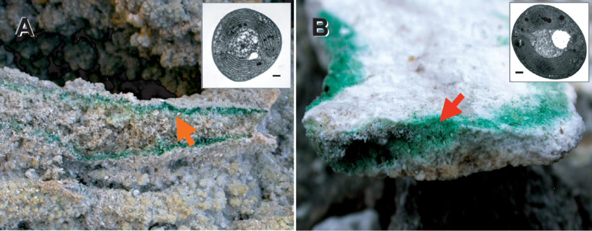 8.  (A) 意大利托斯卡納Larderello的巖石內(nèi)和(B)那不勒斯Pisciarelli的青綠藻。箭頭表示在這些地點(diǎn)的巖石內(nèi)部繁盛的青綠藻生物群落。右上角電鏡圖像分別顯示了兩種Galdieria的細(xì)胞結(jié)構(gòu),比例尺= 1 μm。(Yoon et al., 2006