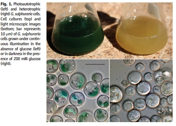這三種藻的營養(yǎng)方式與其生境可以對(duì)應(yīng)起來, C.caldariumC. merolae主要是在巖石表面發(fā)現(xiàn)的,而G. sulphuraria則是從巖石更內(nèi)層中分離出來,這個(gè)部位陽光穿透不足,迫使細(xì)胞轉(zhuǎn)向異養(yǎng)。