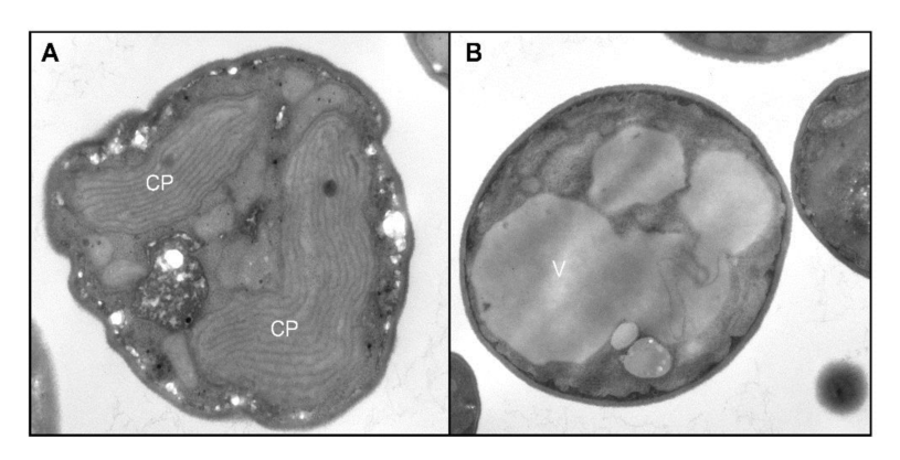 圖11. 光養(yǎng)(A)和異養(yǎng)(B)條件下G. sulphuraria 細(xì)胞電鏡照片,可以觀察到異養(yǎng)條件下葉綠體(CP)的缺失,轉(zhuǎn)化為前質(zhì)體,并出現(xiàn)個(gè)大液泡(V),(Martínez García,  2017)