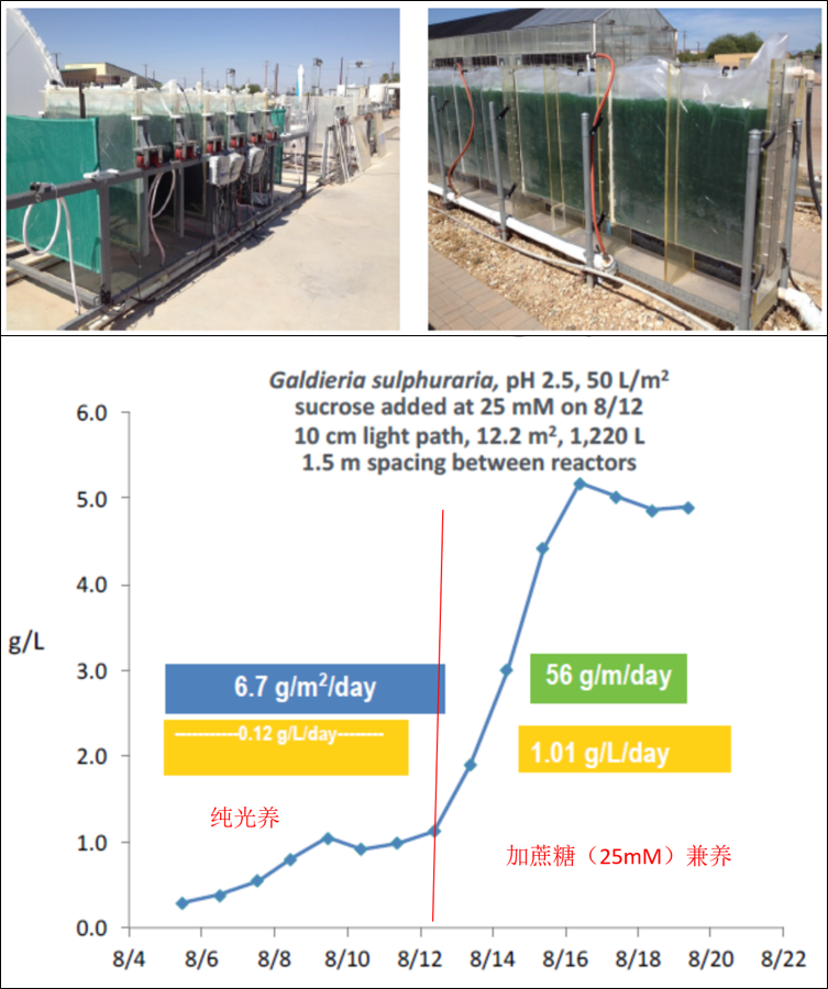 G. sulphuraria在“光照+有機(jī)碳源”的方式下,在室外以板框式反應(yīng)器(光程10cm)為養(yǎng)殖裝置,設(shè)置pH=2.5,利用蔗糖為碳源進(jìn)行兼養(yǎng),指數(shù)階段生物量增長速度可以達(dá)到1g/L/天。