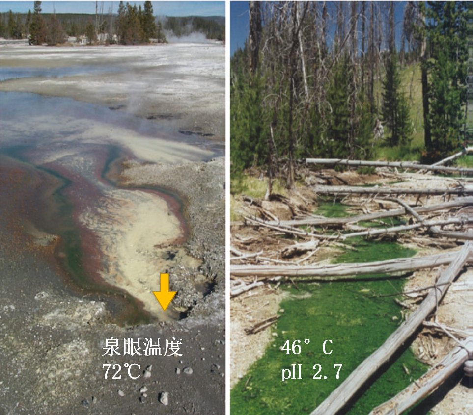 14. 黃石國家公園中的青綠藻藻苔。(a)諾里斯間歇泉盆地(Norris Geyser Basin)龍泉(Dragon Spring)里狹窄的綠色藻帶。(b)位于圓形劇場溫泉地區(qū)(Amphitheater Springs area)的檸檬溪(Lemonade Creek)里的藻苔。