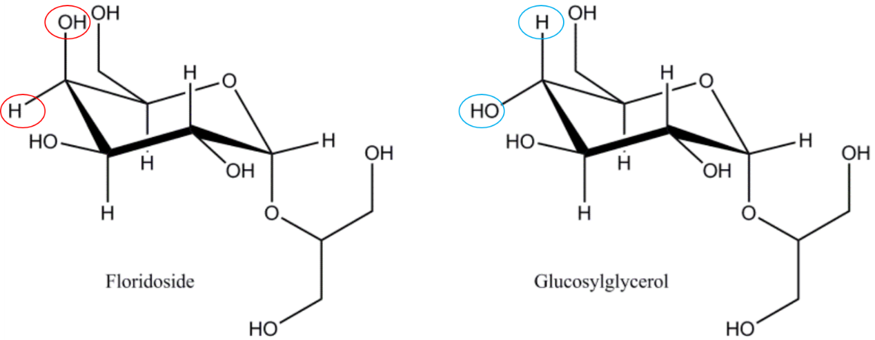 佛羅里達(dá)苷/甘油半乳糖苷(2-O-α-D-galactopyranosylglycerol)和甘油葡萄糖苷(2-O-α-D-glucopyranosylglycerol),注意佛羅里達(dá)苷與甘油葡萄糖苷在分子構(gòu)象上的差異,佛羅里達(dá)苷是紅藻光合作用的主要產(chǎn)物,佛羅里達(dá)苷是紅藻為動(dòng)態(tài)碳庫,在同化為多糖分子(淀粉/糖原/細(xì)胞壁多糖)之前被暫時(shí)存儲(chǔ)。