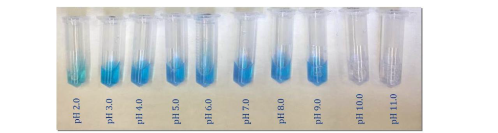 不同pH值下,G. sulphuraria藻藍(lán)蛋白的顯色情況,脫色主要原因?yàn)榘l(fā)色團(tuán)脫落(Ferrar et al., 2018)