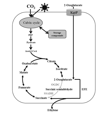 因藍(lán)細(xì)菌三羧酸循環(huán)相對(duì)獨(dú)特,缺乏α-酮戊二酸脫氫酶,α-酮戊二酸到琥珀酸的轉(zhuǎn)化,可由α-酮戊二酸脫羧酶(ogdc)和琥珀酸半醛脫氫酶(ssadh)催化完成。為增加efe的直接底物α-酮戊二酸的供應(yīng)同時(shí)進(jìn)一步提高乙烯產(chǎn)量,研究人員敲除了乙烯合成菌株odgc和ssadh的編碼基因,同時(shí)在這兩個(gè)位點(diǎn)各引入一份 efe拷貝。研究者還在所構(gòu)建的三拷貝efe菌株中表達(dá)了來(lái)源于大腸桿菌的α-酮戊二酸通透酶,在外源添加α-酮戊二酸的條件下分析了乙烯合成菌株的碳源分配,從而進(jìn)一步提高了乙烯產(chǎn)量。經(jīng)過(guò)培養(yǎng)條件優(yōu)化,基因工程藍(lán)細(xì)菌的乙烯產(chǎn)能最終可達(dá)9.7mll -1h-1,為目前報(bào)道的最高水平。