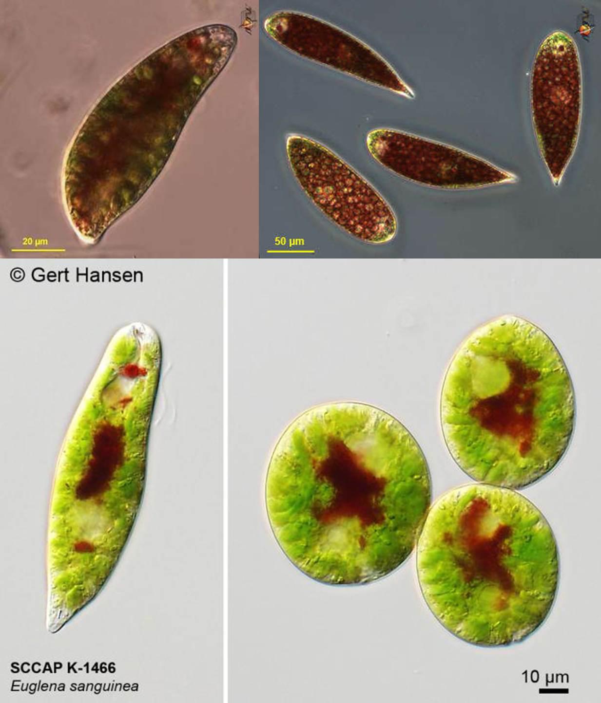 圖20. 血紅裸藻,上圖顏色深重(http://cfb.unh.edu/),下圖紅色色素較少(SCCAP K-1466)。血紅裸藻的細(xì)胞顏色因品系及培養(yǎng)條件有關(guān)。