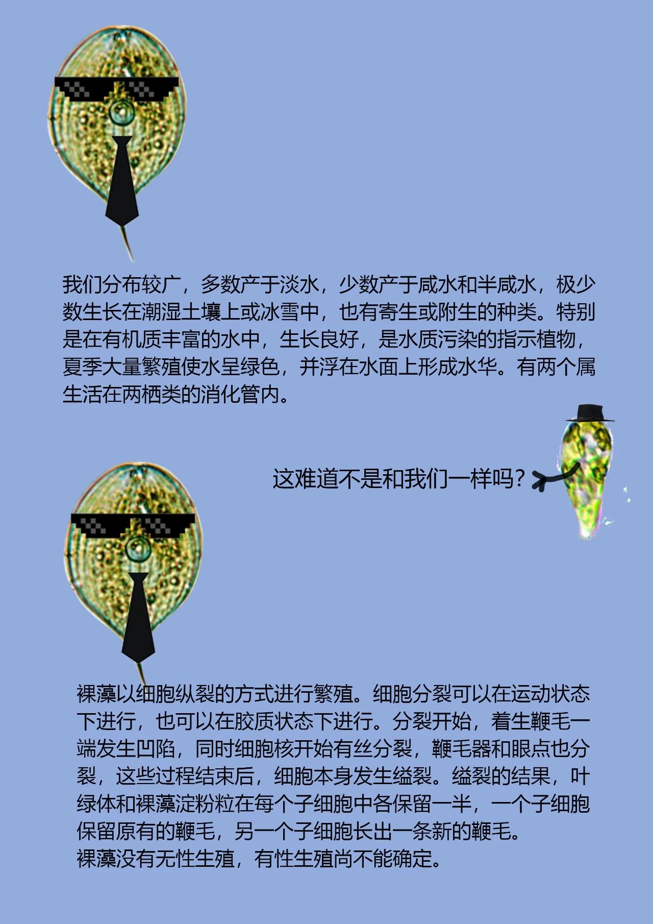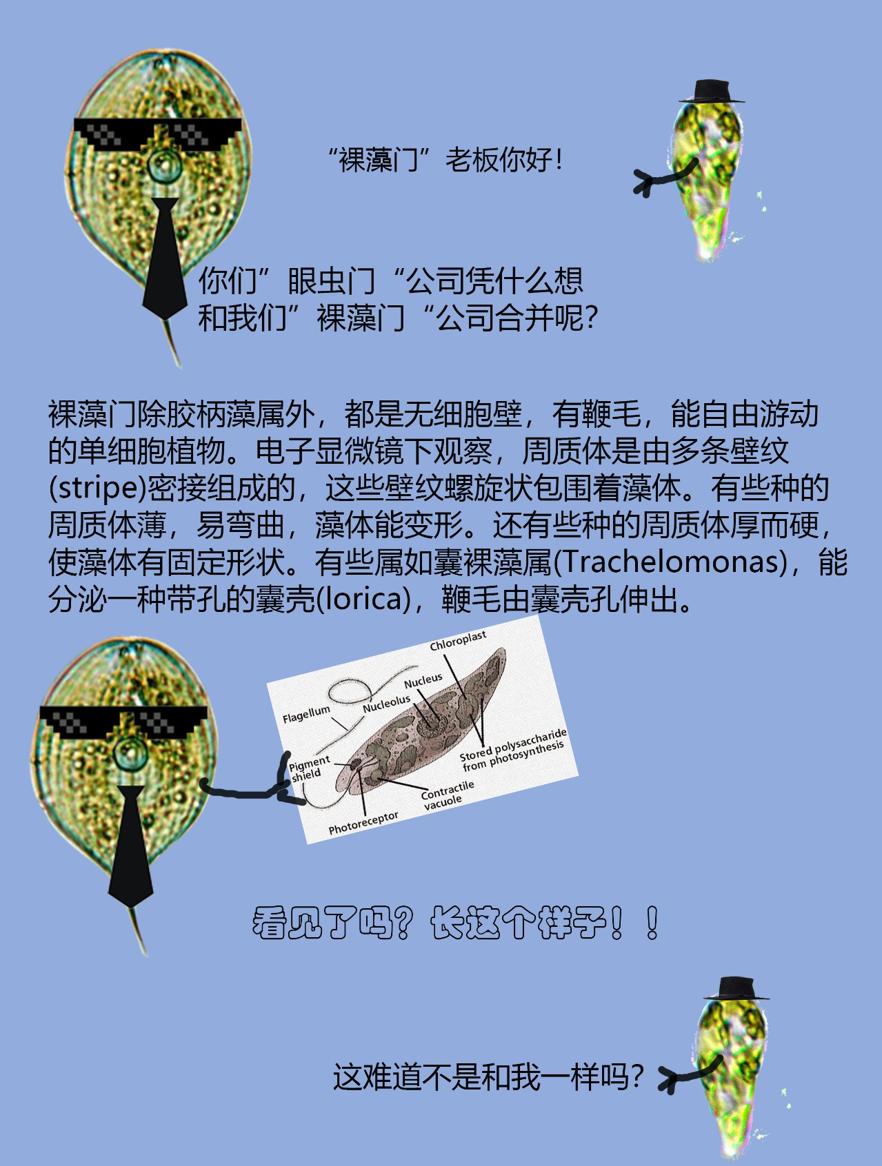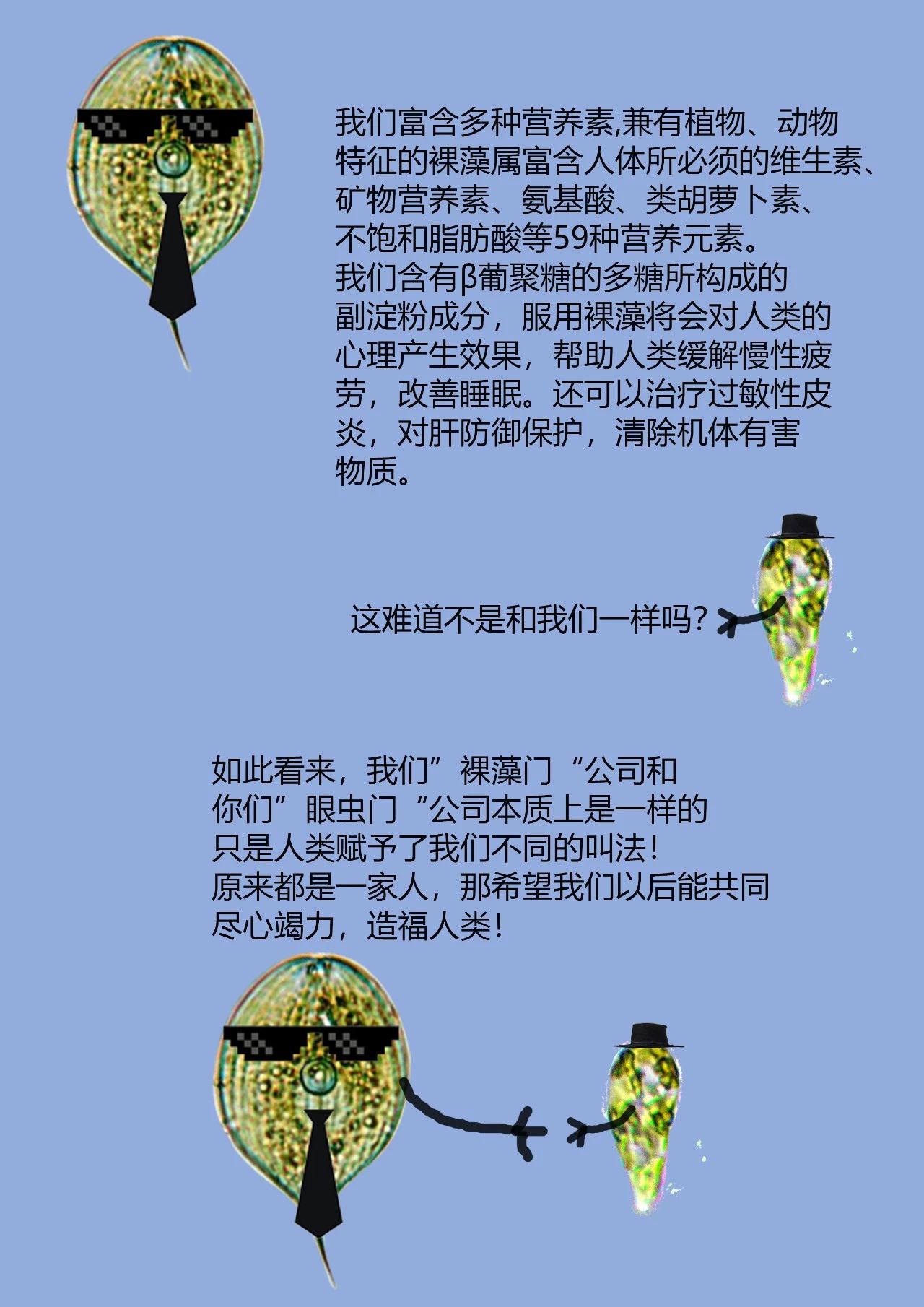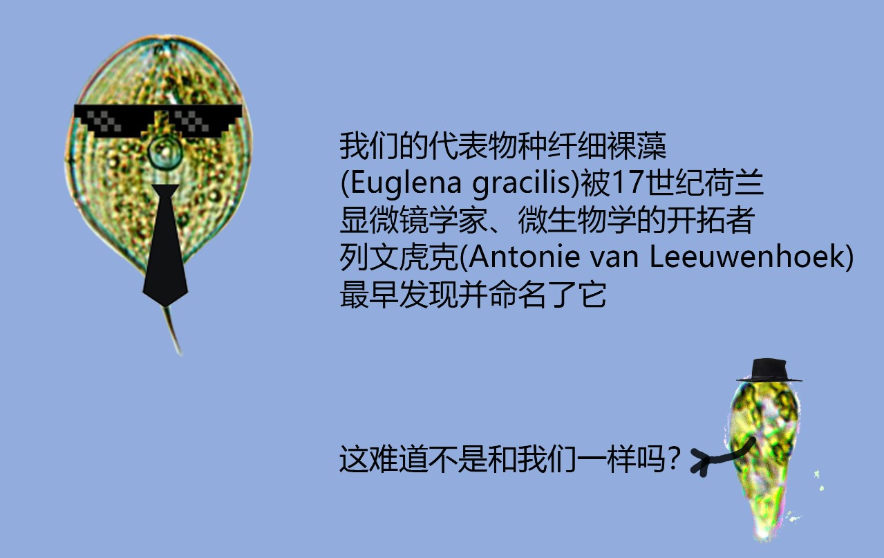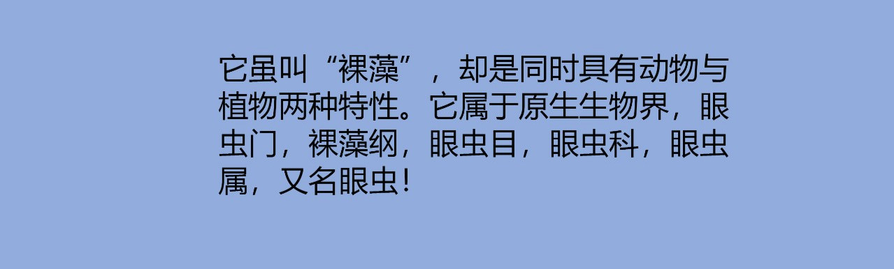 原來裸藻是古代原生動物眼蟲的植物學名稱,因為眼蟲同時具有動物與植物兩種特性,它是一種”原生動物”,但是同時,眼蟲的細胞卻又有含葉綠素的葉綠體,能夠進行光合作用,自己制造營養(yǎng)。因此,植物學家認為,它是一種”原生植物”;由于它的細胞外面沒有細胞壁,植物學家給它起了另外一個名字–裸藻