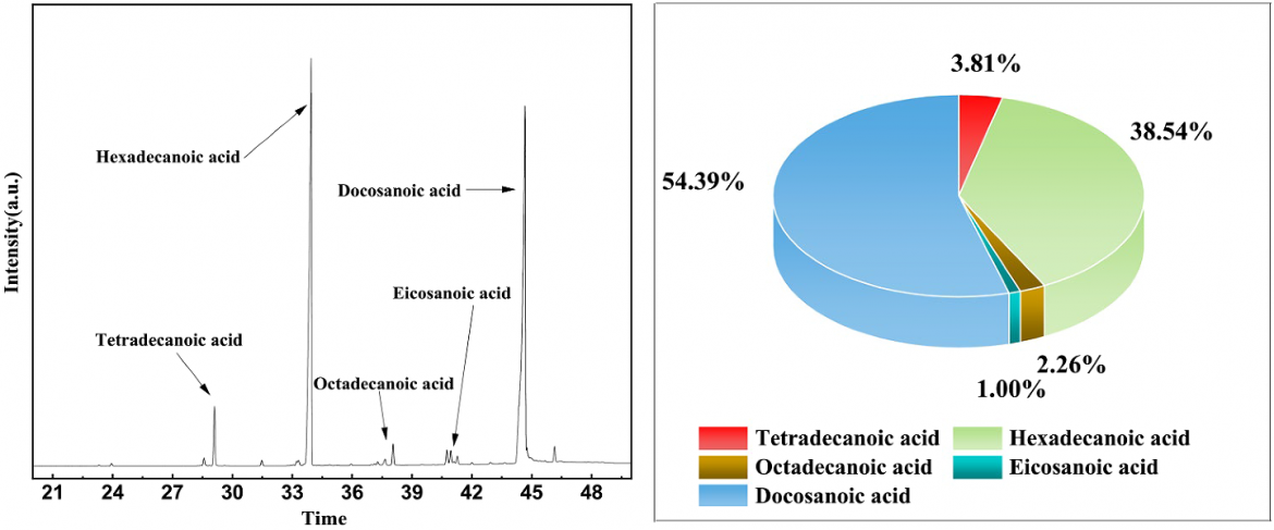 為了高效地將微藻轉(zhuǎn)化為有價值的和可再生的燃料,首先得提取藻油,然后轉(zhuǎn)化為第二代的生物柴油。藻油提取過程中,因為極性的細胞膜易溶于極性溶劑中,極性的甲醇,為最佳提取溶劑,提取率為47.8%。藻油中,38.54%為十六烷酸,54.39%為二十二烷酸。在藻油的脫氧催化反應中,因為鈷-鋁納米片具有更高的鈷含量以及層狀結(jié)構(gòu),可暴露出更多的鈷位點,具有更大的色散以及更小的粒徑,鈷-鋁納米片比鈷-氧化鋁具有更高的催化活性。當反應溫度上升到240℃,可獲得100%的轉(zhuǎn)化率以及100%的烷烴收率,繼續(xù)升高溫度會產(chǎn)生裂化反應。