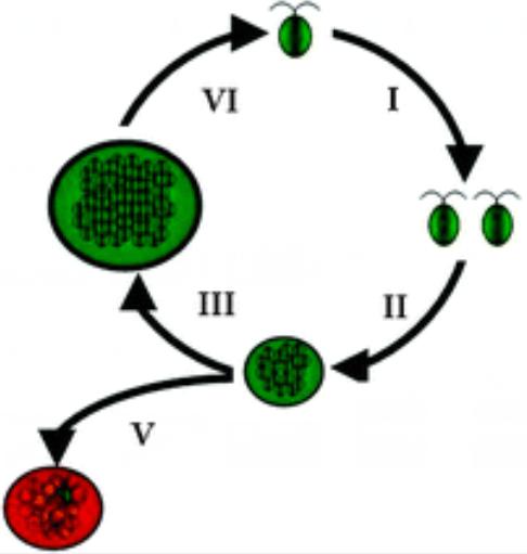 圖4. 雨生紅球藻不動(dòng)孢子進(jìn)入繁殖周期的示意圖 (from algaecan.com)