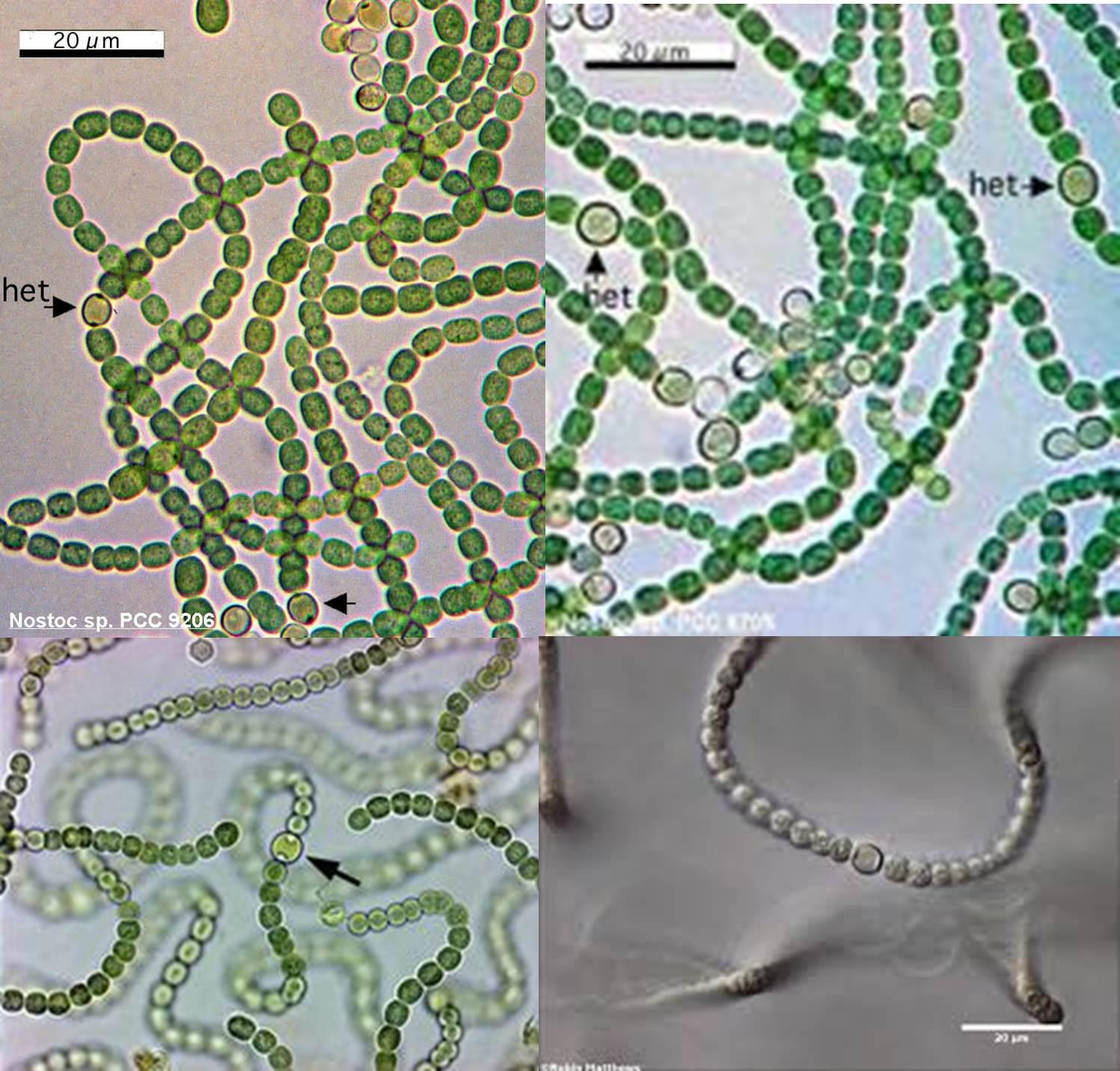 現(xiàn)在我們?cè)俎D(zhuǎn)回到顯微鏡下去看看,如圖所示(黑箭頭所標(biāo)的het),在念珠藻的藻細(xì)胞鏈中,有個(gè)別細(xì)胞膨大有別于常規(guī)的細(xì)胞,這種細(xì)胞稱為異形胞(heterocyst),是一種變態(tài)營(yíng)養(yǎng)細(xì)胞(不僅在念珠藻中,其他一些絲狀藍(lán)藻也有此現(xiàn)象),而那些常規(guī)的細(xì)胞我們稱為普通營(yíng)養(yǎng)細(xì)胞,這種異形胞通常比普通營(yíng)養(yǎng)細(xì)胞大,壁更加厚。異形胞是藍(lán)藻進(jìn)行固氮的場(chǎng)所,可以將空氣中的氮?dú)廪D(zhuǎn)化為藻體可用的銨態(tài)氮;它的另一個(gè)作用是,細(xì)胞鏈通常在此斷裂,形成若干短一點(diǎn)的藻細(xì)胞鏈,稱為藻殖段,此藻殖段可進(jìn)行繁殖,不斷增加長(zhǎng)度,形成新的細(xì)胞群體;同時(shí),某些念珠藻的異形胞在條件合適時(shí),還可以直接萌發(fā)產(chǎn)生新的藻體。