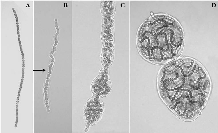 圖11.葛仙米藻絲群體發(fā)育過(guò)程;A.藻絲,B.具有鞘的絲狀體,C.非絲狀體群體和D.絲狀體群體。(引自鄧中洋博士論文,2006)