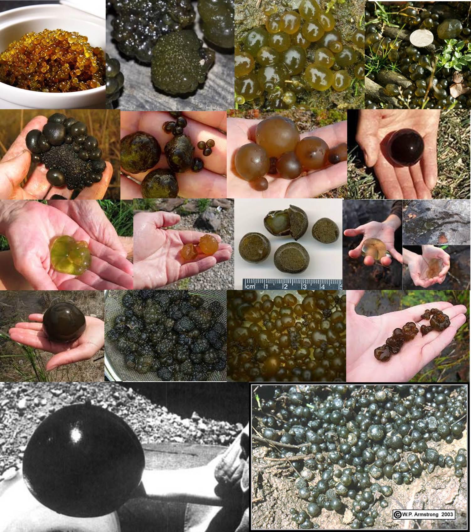 圖7. 不同大小不同顏色的(近)球狀的念珠藻(左下角最大的那個(gè)重2.6公斤,直徑22cm,估計(jì)生長(zhǎng)了大約9-14年,老俞看到此圖一下子覺(jué)得自己沒(méi)見(jiàn)過(guò)世面,應(yīng)該再回去讀一遍博士。圖片收集感謝神梯,度娘還是差了點(diǎn)啊)