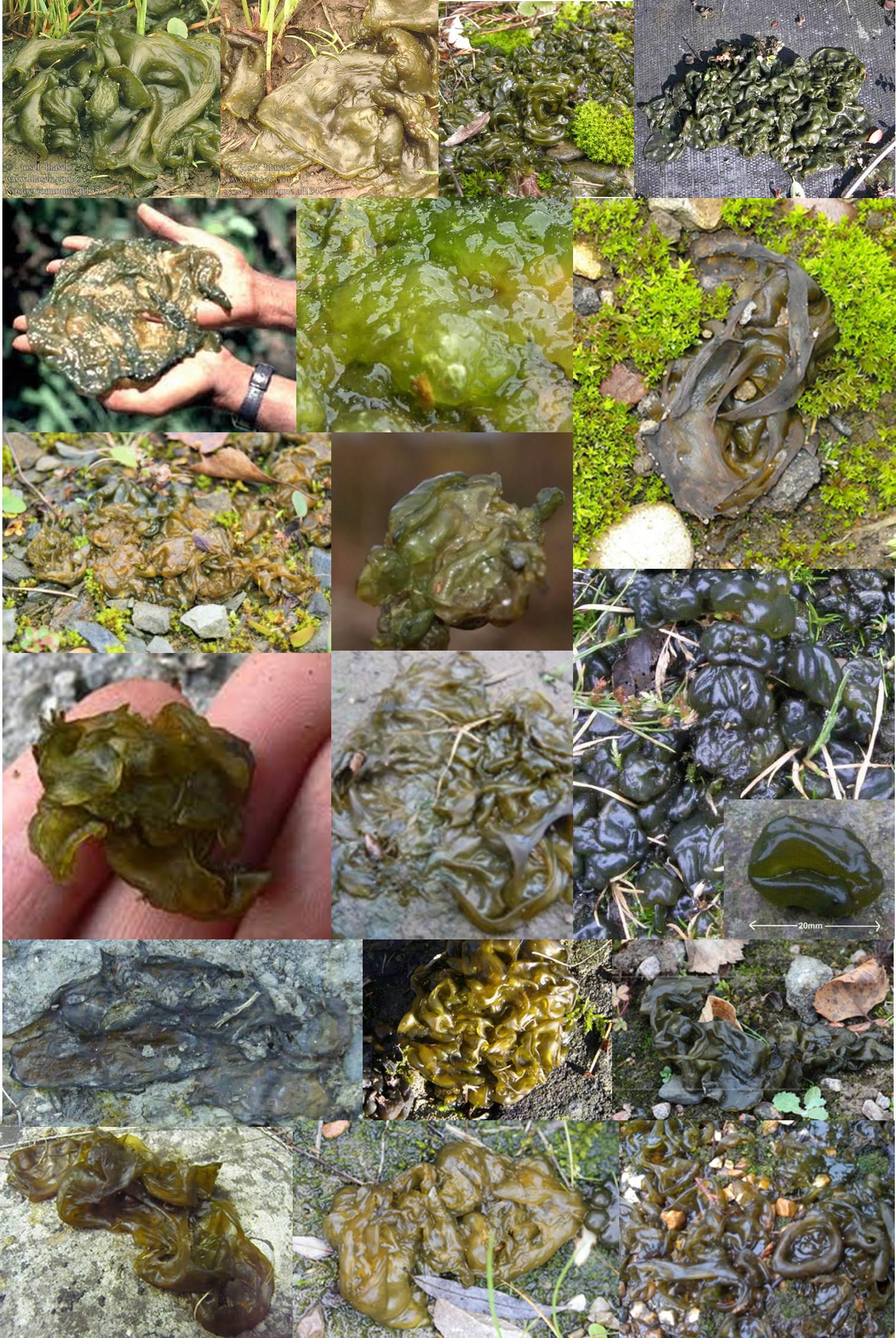 圖9.各色形狀的絲狀念珠藻(上半部a為球狀的普通念珠藻,其他為世界各地的發(fā)狀念珠藻;下半部(黃線以下)為部分發(fā)狀念珠藻的干品狀態(tài)。M. Aboal et. Al., 2016)