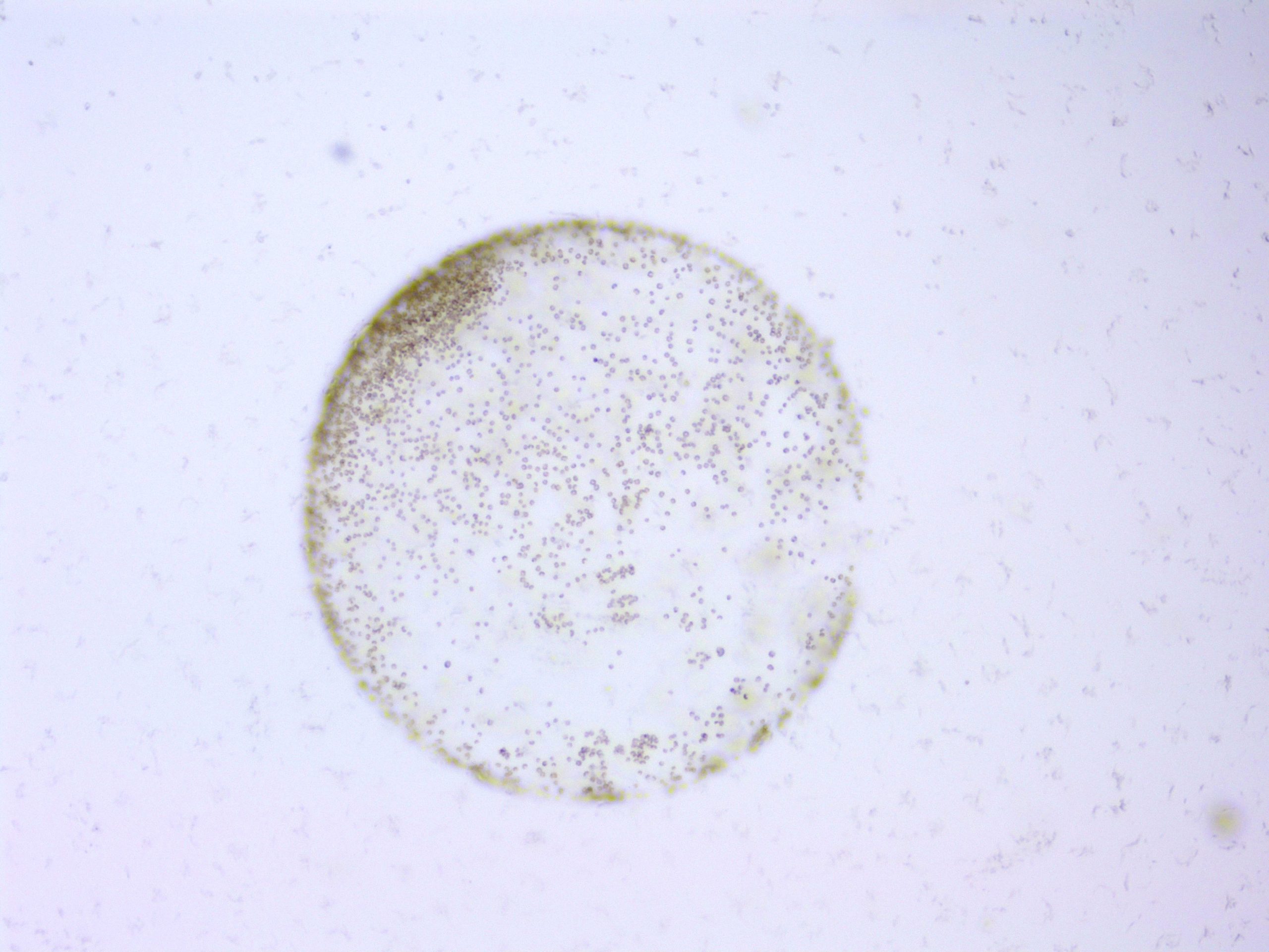 棕囊藻由幾千乃至數(shù)萬個單細胞所構成。膠質囊由小到大,其外觀顏色從淺綠色、深綠色、淺棕色至咖啡色。群體膠質囊為球形或卵圓形,大小為110μm-2.6cm。直徑在150μm以下的小膠質囊呈略似實心的球體,細胞分布不均,大小只有3.1-5.2μm;當直徑大于200μm后,膠質囊已呈中空狀,細胞均勻地分布在膠質囊表面,細胞大小增至6.2-7.4μm,群體膠質囊細胞內的2個杯狀色素體沿著細胞周壁相向嵌合。游泳的單細胞形態(tài),細胞常呈球形或近球形,前端略凹入,直徑2.5-7.0μm,前端具兩條幾乎等長的鞭毛,約為體長的1.5-2倍,一條向前呈波狀運動,一條斜向后方;除兩條鞭毛外還有一條短的頂鞭絲。細胞具2-3個色素體,圓盤狀和片狀,周生,黃褐色。細胞一不斷的分裂進行增殖。