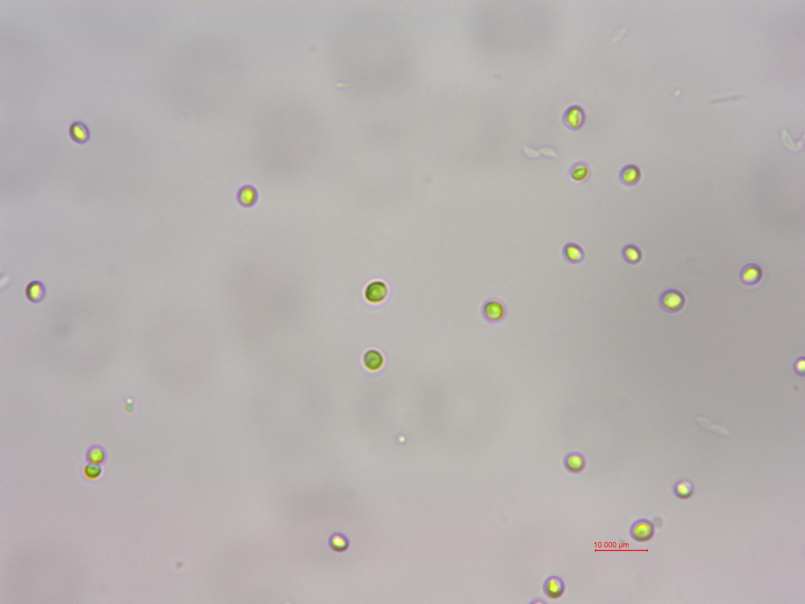 小球藻(Chlorella vulgaris)綠藻綱,小球藻科。單細(xì)胞藻,常單生,也有多細(xì)胞聚集。細(xì)胞球形、橢圓形,內(nèi)有一個(gè)周生、杯狀或片狀的色素體。無(wú)性繁殖,每個(gè)細(xì)胞可以產(chǎn)生2、4、8或16個(gè)似親孢子,成熟時(shí)母細(xì)胞破裂,孢子逸出,長(zhǎng)大后即為新個(gè)體。世界各地均有分布,多生活于較小淺水,也有海產(chǎn)種類。天然條件下個(gè)體較少,人工培養(yǎng)大量繁殖。細(xì)胞內(nèi)的蛋白質(zhì)、脂肪和碳水化合物含量都很高,又有多種維生素,可食用和作為餌料 [1] ?。