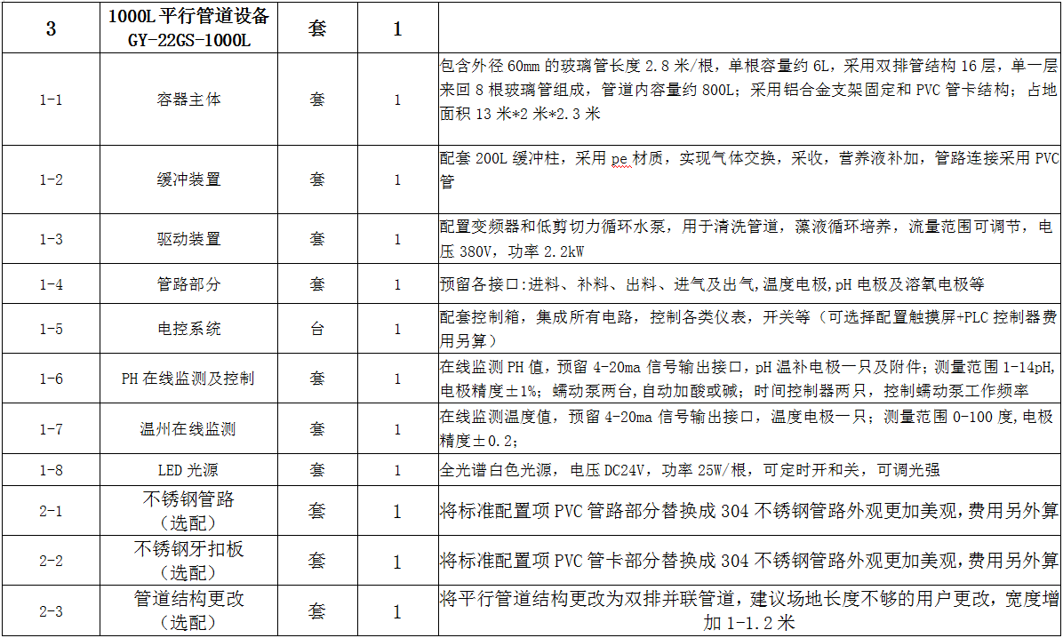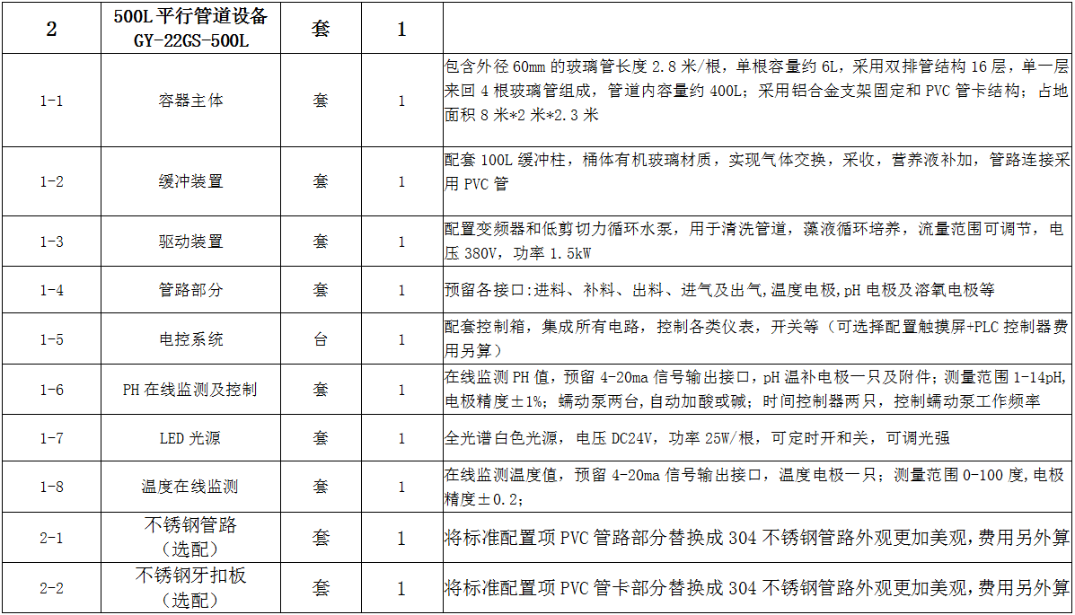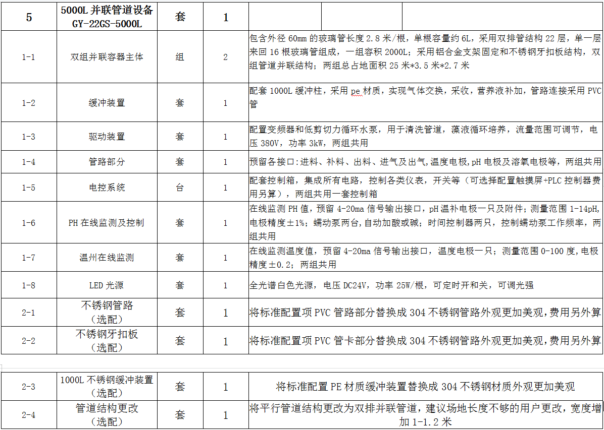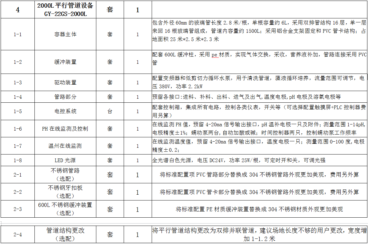 - 可以根據(jù)客戶不同養(yǎng)殖藻類設計不同的管道式光生物反應器結構,隨意增減容量,適應于實驗室或者大規(guī)模工業(yè)使用