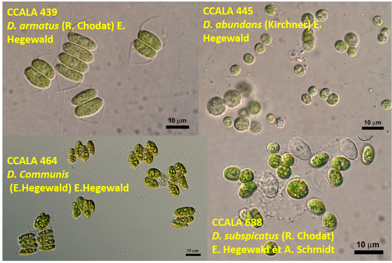 我們通常的印象里,柵藻(廣義上的,即包括柵藻屬Scenedesmus和鏈帶藻屬Desmodesmus)是四個(gè)細(xì)胞一個(gè)克?。?lián)生體),而實(shí)際上,很多種存在單細(xì)胞的形式。尤其鏈帶藻屬下,因芒刺的存在,會(huì)阻礙多個(gè)細(xì)胞形成聯(lián)合而形成單個(gè)細(xì)胞形式;也會(huì)因?yàn)榉敝硶r(shí)多個(gè)子細(xì)胞形成的克隆分散展開而形成單個(gè)細(xì)胞形式(一個(gè)克隆可分散為多個(gè)子體,細(xì)胞數(shù)可能不同)。無芒刺的柵藻屬單細(xì)胞形式形成更傾向后者方式。