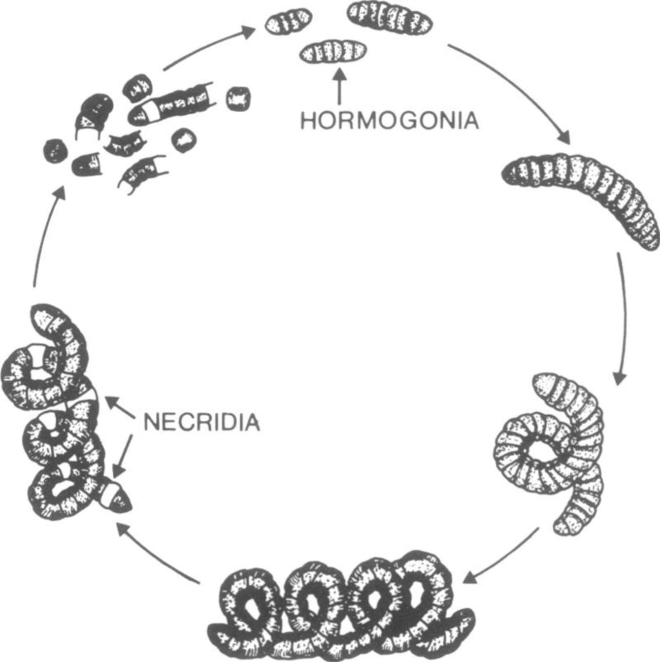 圖1.螺旋藻的生活史。 螺旋藻的繁殖,開始可見在成熟的藻絲體中出現(xiàn)一種漸進性變化的特化細胞(necridia),使藻體裂散成許多雙凹面的碟狀體,漸漸地衍變?yōu)榧s含有數(shù)個單細胞連鎖性原細胞(hormogania),這就是新生的藻絲體。在連鎖性原細胞中的單細胞失去其原附著在特化細胞上的蛋白質(zhì),終端變園,在這初期衍變過程中,胞漿呈淡藍綠色,少見顆粒形成。隨著細胞分裂使藻絲體中連鎖細胞數(shù)量增加,胞漿中顆粒形成,其色彩轉(zhuǎn)呈鮮艷的藍綠色,這時藻絲延長而曲卷成為典型的藻絲體。(Orio Ciferri,1983)