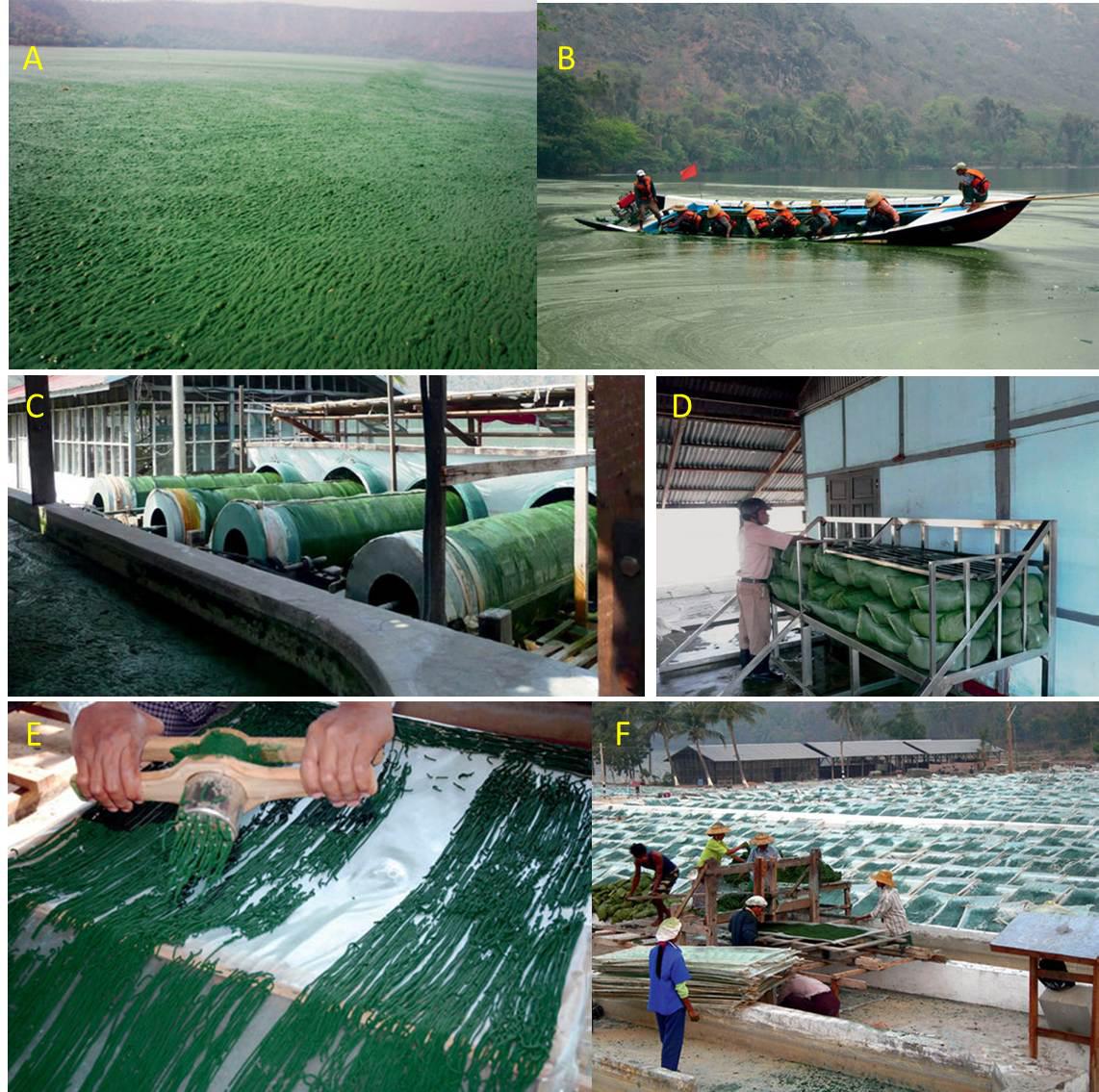 圖10. 緬甸產(chǎn)自湖泊的螺旋藻的加工方式。A.每年3月Twyn Taung湖表面厚厚一層螺旋藻藻華,B.工人駕著船采集螺旋藻,C.篩絹滾筒用于清洗螺旋藻藻泥,D.利用濾袋脫水,E.將藻泥積壓成面條狀,F(xiàn).在陽光下曬干。