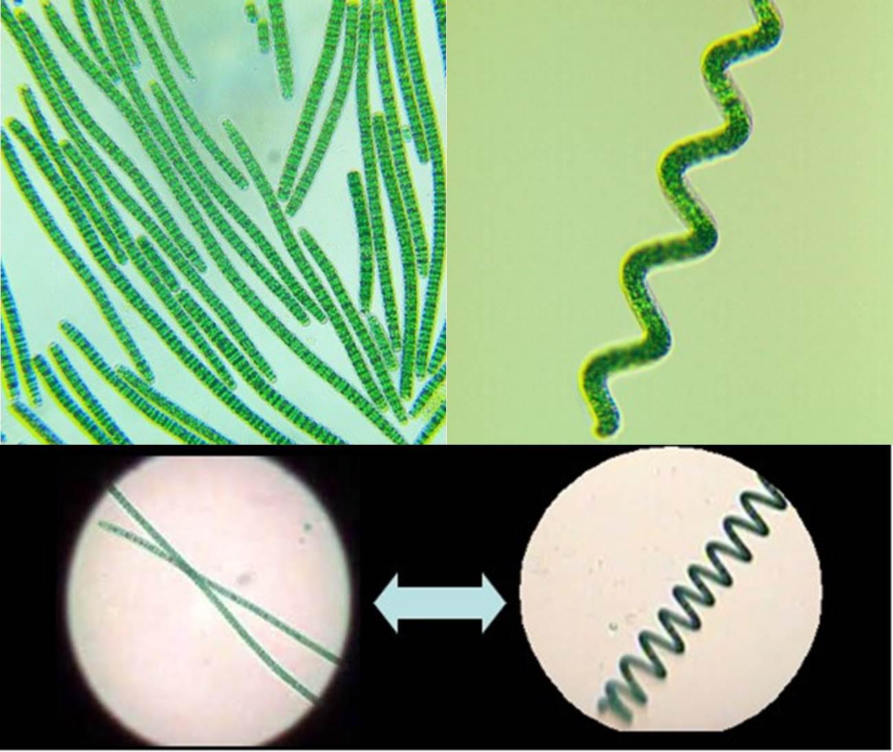 圖3.直線型與螺旋線細胞群體,(圖上左為直線型細胞株TBSM1-5,圖上右為螺旋型細胞株TBSHX-1,均引自http://algae-lab.com/,下圖引自http://www.spirulinaacademy.com/)
