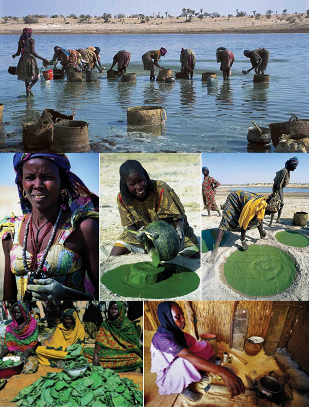 圖6.乍得Kanembu族土著在非洲乍得湖岸附近的小水塘采收螺旋藻,做成的干藻塊稱為“Dihé”。