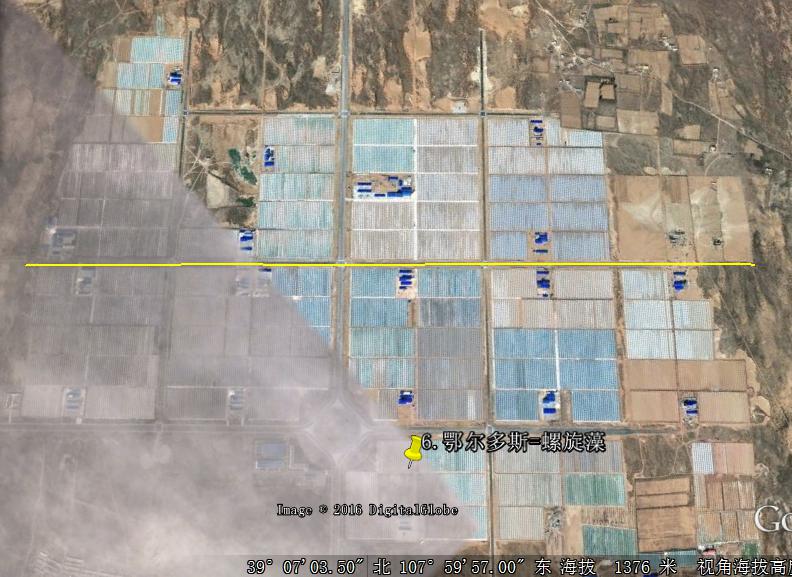圖8.位于內(nèi)蒙古鄂爾多斯鄂托克旗螺旋藻產(chǎn)業(yè)園衛(wèi)星俯瞰圖,圖中黃線長度約為2.8千米。