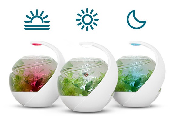 此外魚缸頂部的LED燈,使用人眼看不到的特殊波長,可有效抑制藻類繁殖,同時提供其他植物生長所需的光源,使其可進行光合作用提供氧氣。LED燈的設計有三種變化,分別是清晨的紅光、白天的日光以及傍晚的藍光,模擬太陽光照從白天到晚上的照周期變化。