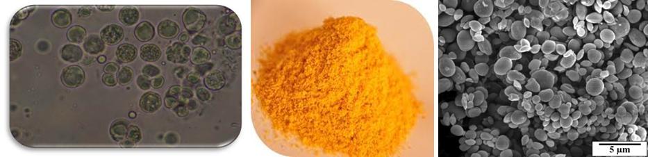 雨生紅球藻 (Haematococcus pluvialis)是一種單細(xì)胞淡水綠藻,屬于綠藻門(Chlorophata)、綠藻綱(( hlorophyceae)、 團(tuán)藻目(Volvocales)、紅球藻科(Haematococcaccae)、紅球藻屬(Haematococcus)。雨生紅球藻在多種不適宜生長的外界環(huán)境條件下會在細(xì)胞核周圍的細(xì)胞質(zhì)基質(zhì)中加速積累次生類胡蘿卜素,其中80%以上為蝦青素(圖1-2)及其酯衍生物。研究證明,蝦青素的抗氧化活性比β-胡蘿卜素、玉米黃素、葉黃素和角黃素等類胡蘿卜素高10倍,比黃體素高200倍,比維生素E高550倍被稱為超級維生素E。