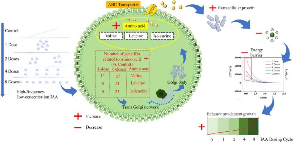 為揭示其內(nèi)在機(jī)制,研究者進(jìn)一步開展轉(zhuǎn)錄組分析,結(jié)果表明高頻低劑量IAA刺激可顯著上調(diào)小球藻中疏水性氨基酸(如亮氨酸、異亮氨酸)的合成通路基因。疏水性氨基酸的增加能夠提升細(xì)胞表面疏水性,增強(qiáng)微藻細(xì)胞與載體間的相互作用,從而加速生物膜的附著與穩(wěn)定。? 該研究不僅闡明了重復(fù)低劑量IAA刺激調(diào)控微藻生物膜附著的規(guī)律與分子機(jī)制,更為工業(yè)應(yīng)用提供了切實可行的技術(shù)參考?;诖搜芯砍晒?,可通過優(yōu)化IAA添加策略,提升微藻生物膜反應(yīng)器的污水處理效率,強(qiáng)化微藻碳捕獲系統(tǒng)的固碳能力,推動微藻技術(shù)在環(huán)境治理與碳中和領(lǐng)域的規(guī)模化應(yīng)用。