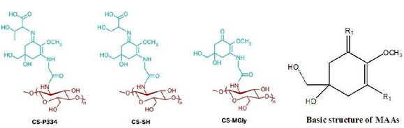 研究人員通過將幾丁聚糖(紅色部分)附著于菌胞素紫球藻-334(mycosporinesporphyra – 334,簡稱CS-P334)、shinorine(簡稱CS-SH)以及菌胞素-甘氨酸(mycosporine-glycine簡稱CS-MGly),創(chuàng)建了穩(wěn)定的防曬材料。幾丁聚糖來源于甲殼類動物的殼,而菌胞素類(mycosporines)則存在于魚黏液和藻類之中。