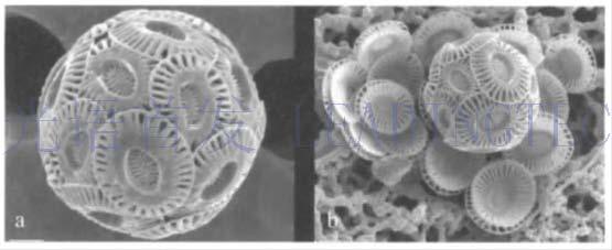 (十)定鞭藻類中,值得一提的有一類微藻,其細胞在一定的時期,表面會形成碳酸鈣質的鱗片狀物質,如倒扣的碟子狀(如圖10),這個結構成為“顆石”,這類藻被稱之為顆石藻類(Coccoliths)。當細胞死亡后,表面的“碟子”就會分散脫落,它是構成海底鈣質軟泥的主要成分。另有研究認為,石灰質的白堊就是由顆石藻和有孔蟲等微小生物的尸體沉積而成(如英國多佛白崖)。圖11所示的藻稱為赫氏顆石藻(Emiliania huxleyi),是一種典型的顆石藻,廣泛分布與世界各個海區(qū)(除極地區(qū)域),這種藻最大的特點就是上文提到的碳酸鈣(方解石)外殼,形成這個外殼的過程,相當于永久性的固定大氣中的二氧化碳,另外赫氏顆石藻在自然海域中會成為優(yōu)勢種,形成獨特的白色藻華,這種藻華被稱為白水現(xiàn)象(white water,http://www.soes.soton.ac.uk/staff/tt/eh/)。