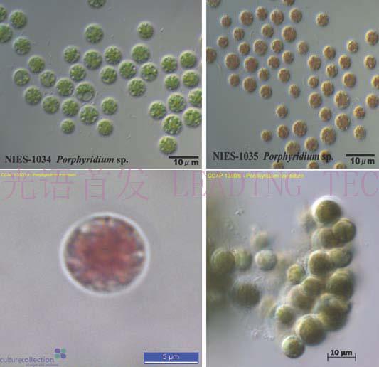 (五)圖5是幾種紫球藻,屬于紅藻門,我們經常吃到的紫菜就是一種大型紅藻,另外石花菜屬、江籬、麒麟菜等都屬于紅藻,可用于提取瓊膠。紅藻門中,單細胞微藻比較少見,且有幾種還是生活在極端環(huán)境中(如生存在熱泉口),紫球藻是紅藻類中典型的單細胞種類。紅藻在進化中,同灰藻門一樣,是比較接近藍藻的真核藻類,紅藻中有某些種類被認為是第一個真核藻類,這點從紫球藻所含有的色素可見一斑,如圖5左上和左下兩種紫球藻,左圖藻種發(fā)藍綠色,藻體中含有藻藍蛋白,而右圖藻種近淡紅紫,藻體中含有藻紅蛋白。紫球藻分布區(qū)域比較廣,海洋淡水咸水湖均有,如左下圖藻種存在于海洋,而右下藻種是從土壤中分離得到的。有關紫球藻的其他內容,以后我們會慢慢講到。