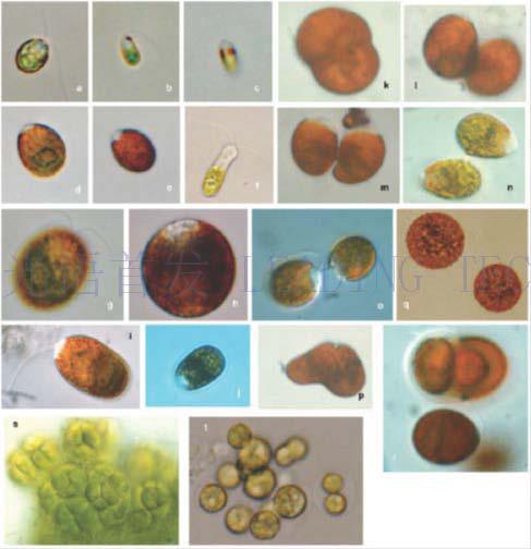 (八)圖8系列展示的是鹽藻(Dunaliella),屬綠藻門、團藻目。這里引用了兩位鹽藻研究大咖的圖。圖8-1引自以色列學者Ami Ben-?Amotz,顯示了鹽藻綠色游動細胞和黃色孢子的形態(tài),該藻有點類似雨生紅球藻,在不利條件下(尤其是高鹽脅迫,最高可耐受飽和鹽水)富集β-胡蘿卜素,研究顯示的含量最高可達14-16%,同時細胞中甘油的含量大幅度提高。鹽藻的種類較多,如圖8-2引自澳大利亞學者Michael A. Borowitzka的著作,展示了多種鹽藻的形態(tài)特征。自然環(huán)境中,鹽藻分布在鹽湖中,通常跟一些噬鹽古細菌一起生存,湖水顏色呈粉紅。